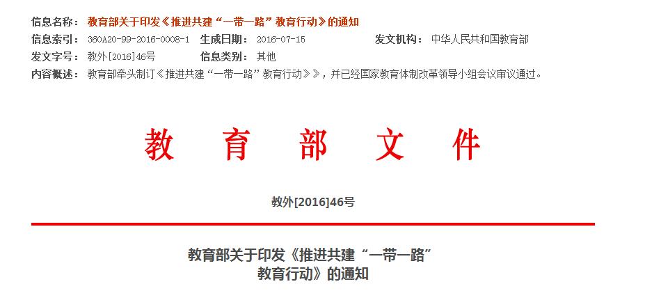 為貫徹落實中辦、國辦《關于做好新時期教育對外開放工作的若干意見》和國家發(fā)展改革委、外交部、商務部經國務院授權發(fā)布的《推動共建絲綢之路經濟帶和21世紀海上絲綢之路的愿景與行動》,我部牽頭制訂了《推進共建“一帶一路”教育行動》,并已經國家教育體制改革領導小組會議審議通過?,F印發(fā)給你們,請結合實際認真貫徹執(zhí)行。